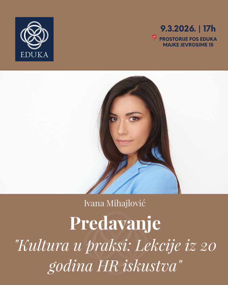 Na Fakultetu organizacionih studija "Eduka" u Beogradu u ponedeljak, 9. marta, sa početkom u 17 časova, biće održano gostujuće predavanje u okviru kursa Korporativna kultura. Predavanje će održati Ivana Mihajlović, Global Talent Development & Culture Director u kompaniji Al Dahra, na temu „Kultura u praksi: Lekcije iz 20 godina HR iskustva“.
