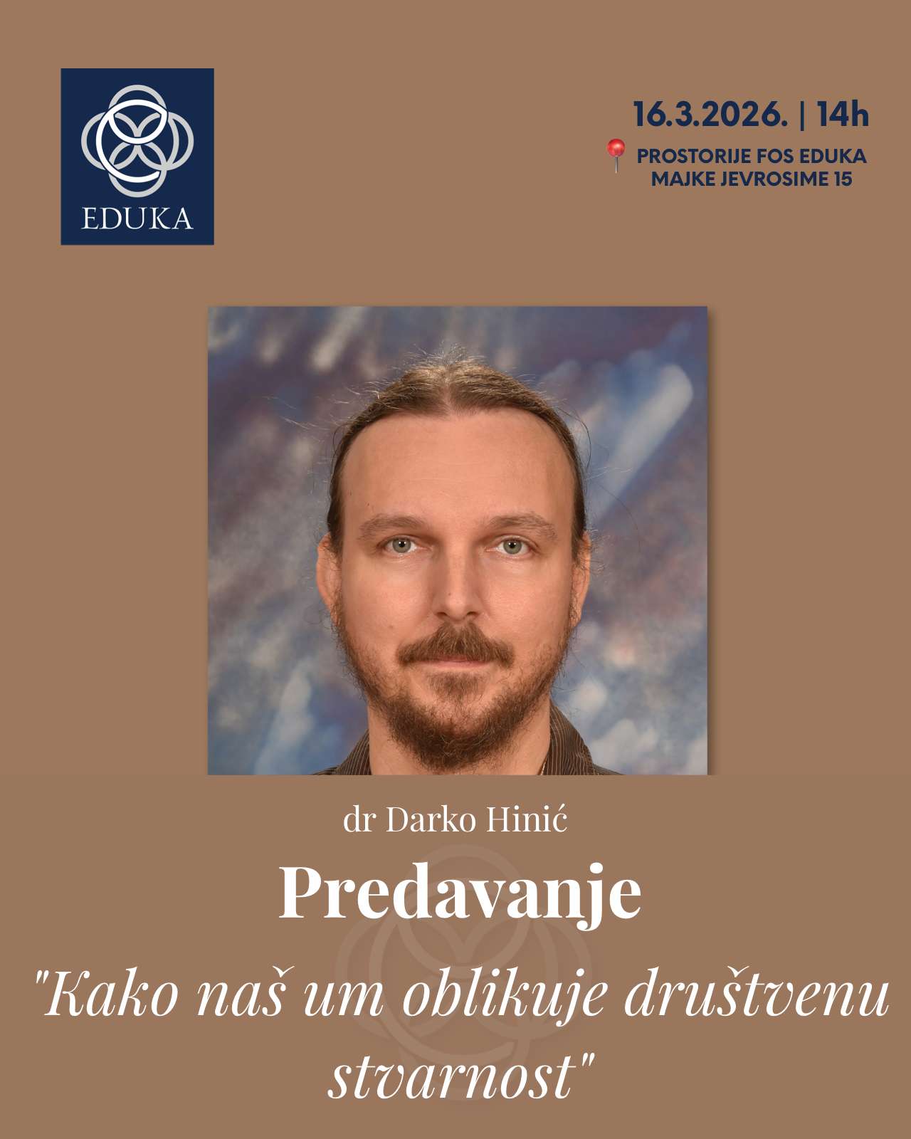 Na Fakultetu organizacionih studija "Eduka" u ponedeljak, 16. marta 2026. godine u 14 časova, biće održano gostujuće predavanje pod nazivom „Kako naš um oblikuje društvenu stvarnost“, koje će održati prof. dr Darko Hinić. Predavanje se realizuje u okviru kursa Socijalna psihologija i otvoreno je za sve studente i zaposlene na fakultetu.
