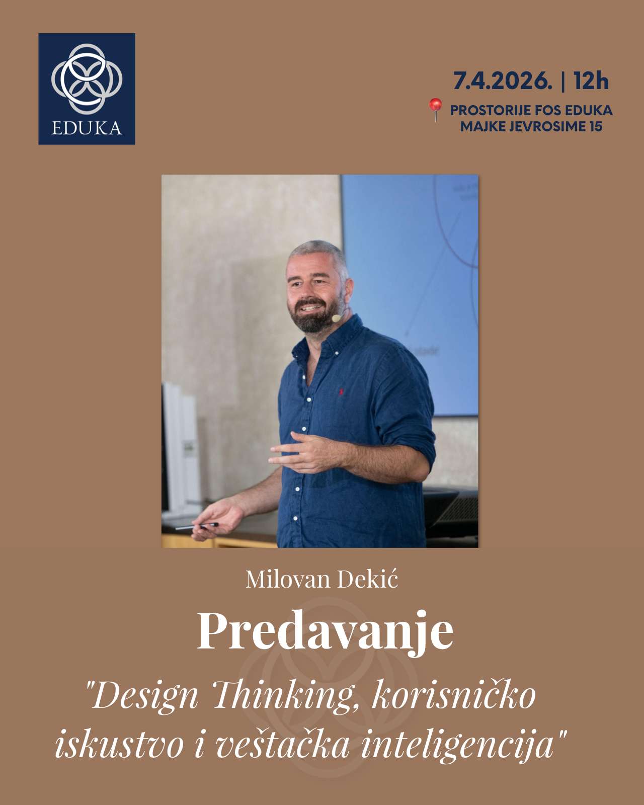 Predavanje će biti dragocena prilika da studenti, nastavnici i svi zainteresovani steknu uvid u aktuelne trendove na preseku design thinking-a, istraživanja korisničkog iskustva i veštačke inteligencije, uz poseban osvrt na praktične primene u industriji.