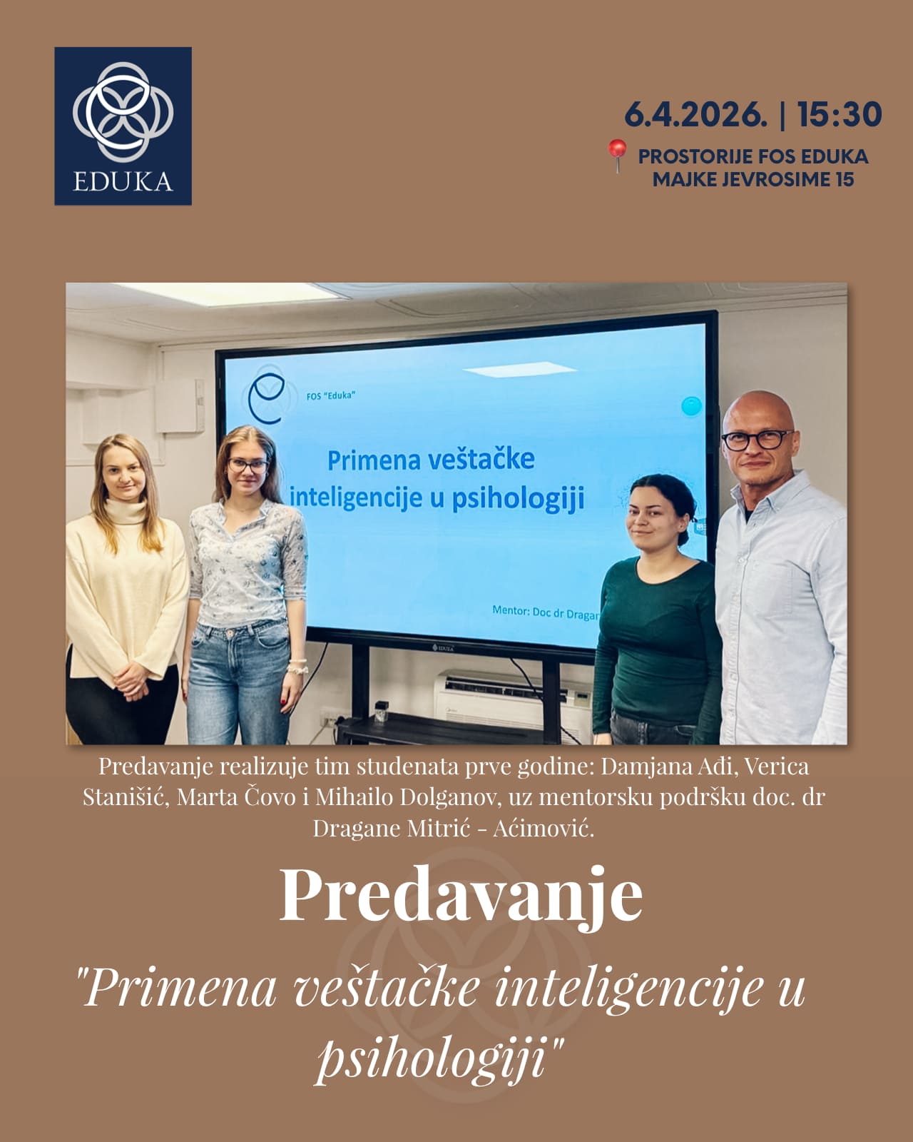 Na Fakultetu organizacionih studija "Eduka" u Beogradu 6. aprila u 15:30 časova (sala u suterenu) biće održano predavanje na temu „Primena veštačke inteligencije u psihologiji“, koje će studenti psihologije održati svojim kolegama sa studijskog programa.